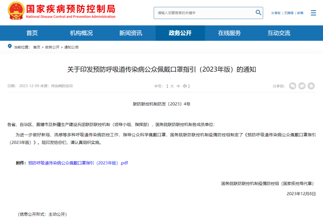 为进一步做好新冠、流感等多种呼吸道传染病防控工作,指导公众科学佩戴口罩,国务院联防联控机制疫情防控组制定了《预防呼吸道传染病公众佩戴口罩指引(2023年版)》。现印发给你们,请认真组织实施。