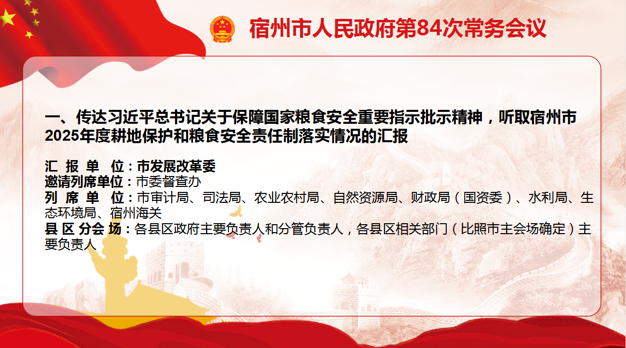 会议传达学习习近平总书记关于保障国家粮食安全的重要论述、中央经济工作会议精神,研究贯彻落实举措;听取并原则同意关于宿州市2025年度耕地保护和粮食安全责任制落实情况的汇报。