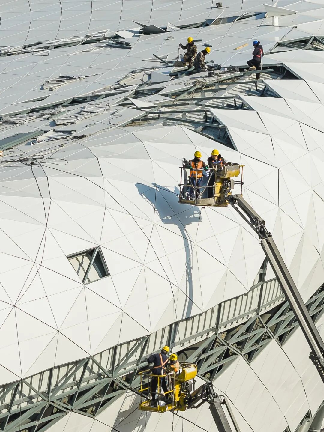 1月8日,中铁四局的工人在宿州市奥体中心项目进行作业(无人机照片)。