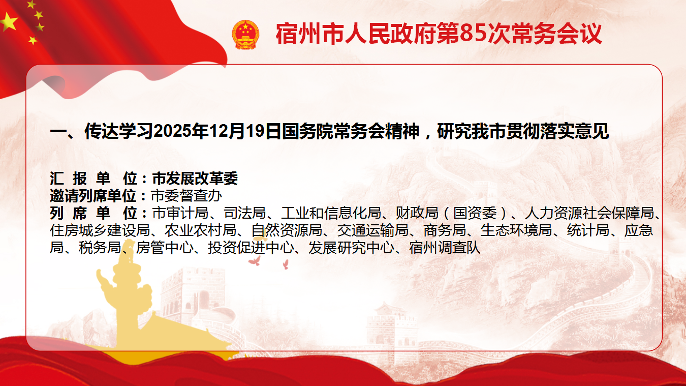 会议传达学习2025年12月19日、12月31日和2026年1月9日国务院常务会议精神,研究贯彻落实举措;审议并原则通过2026年市《政府工作报告》、《宿州市国民经济和社会发展第十五个五年规划纲要(草案)》等。