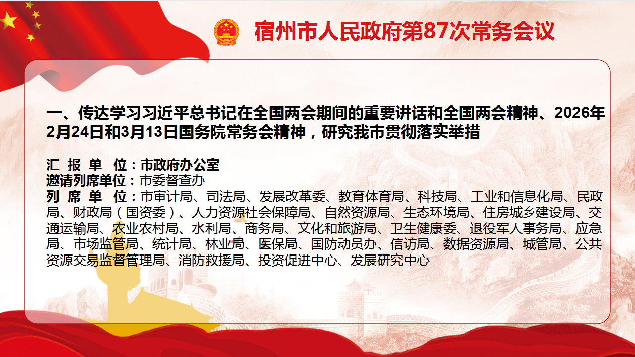 会议传达学习习近平总书记在全国两会期间的重要讲话和全国两会精神、2月24日和3月13日国务院常务会议精神,研究贯彻落实举措;审议并原则通过《宿州市阳台经济专项发展规划》。