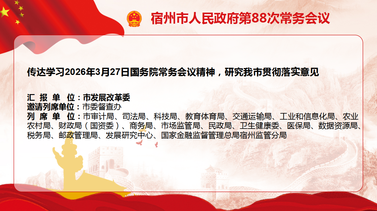 会议传达学习3月27日国务院常务会议精神,研究贯彻落实举措;审议并原则通过《宿州市有效投资上台阶行动方案(2026)》。