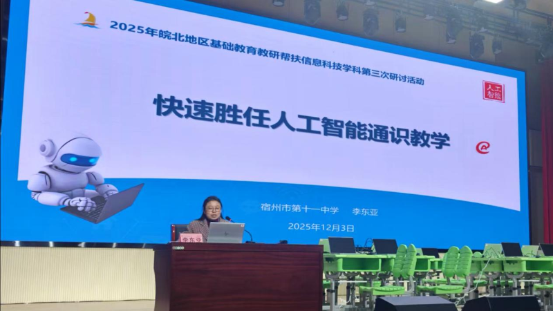 2025年皖北地区基础教育教研帮扶信息科技学科第三次研讨活动于12月1-4日在蚌埠三实小兴华校区顺利开展,宿州市信息科技教研团队深度参与,与蚌埠同仁协同教研,通过课例展示与专题讲座,共同展现了区域在推进人工智能通识教育上的探索成果。