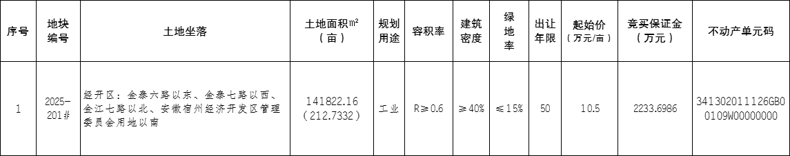 2025-201#地块要求:1、竞买人须为公司法人。2、依据安徽宿州经济开发区管理委员会函,该宗地为“标准地”出让;产业类型属化学原料和化学制品制造业;《工业项目用地投入产出监管合同》约定固定资产投资强度不少于200万元/亩,亩均税收不低于15万元/年,其他具体指标要求详见《工业项目用地投入产出监管合同》。此条款由安徽宿州经济开发区管理委员会及税务部门负责监督落实。3、竞得人在签订该宗地《成交确认书》后30日内与安徽宿州经济开发区管理委员会签订《工业项目用地投入产出监管合同》(详见挂牌文件)。4、出让合同签订之日起1个月内缴清全部土地出让金。5、竞得人须自签订出让合同之日起6个月内实质性开工建设,并在开工建设后2年内竣工。6、自签订出让合同之日起7日内由安徽宿州经济开发区管理委员会办理土地移交手续,并负责监督受让方将合同条款履行到位。宗地范围内建筑物及其他附着物拆迁至室内地坪,其他维持现状;外部条件(道路、水、电、气等)均以现状为准。7、受让人要按合同规定的用途和规划条件通知书的要求进行建设,未经宿州市政府批准不得擅自改变用途、不得分割转让;否则,无偿收回该土地使用权。