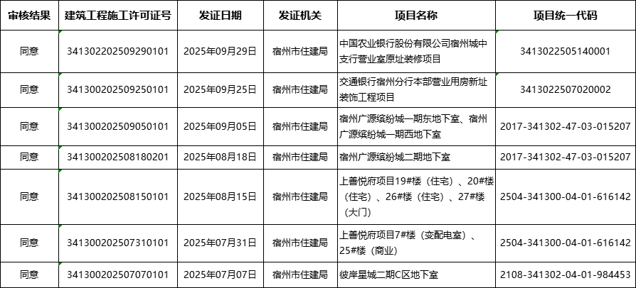 宿州市住建局2025年第三季度建筑工程施工许可证核发