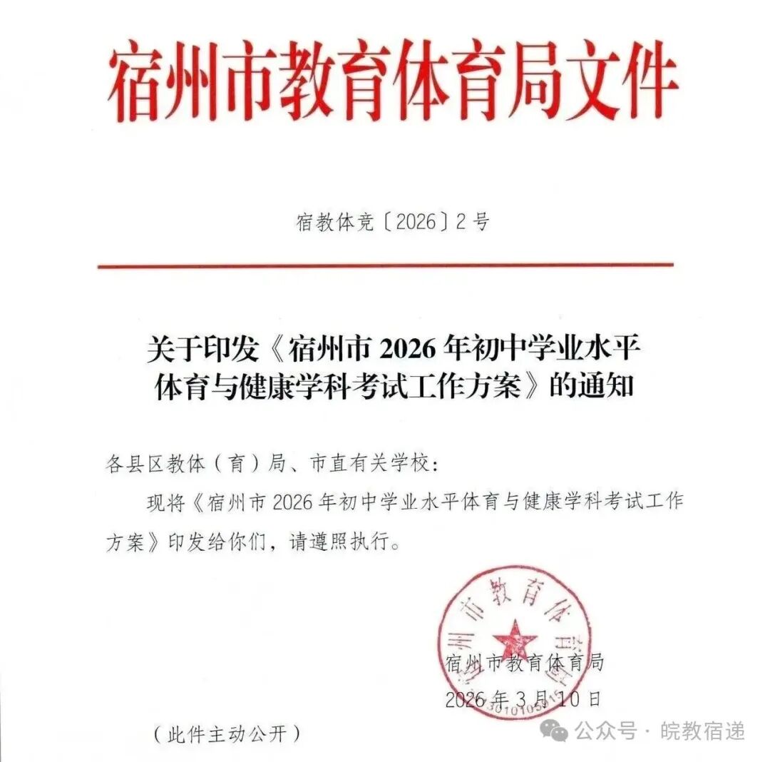 3月10日,宿州市教育体育局下发宿州市2026年初中学业水平体育与健康学科考试工作方案。具体如下:
