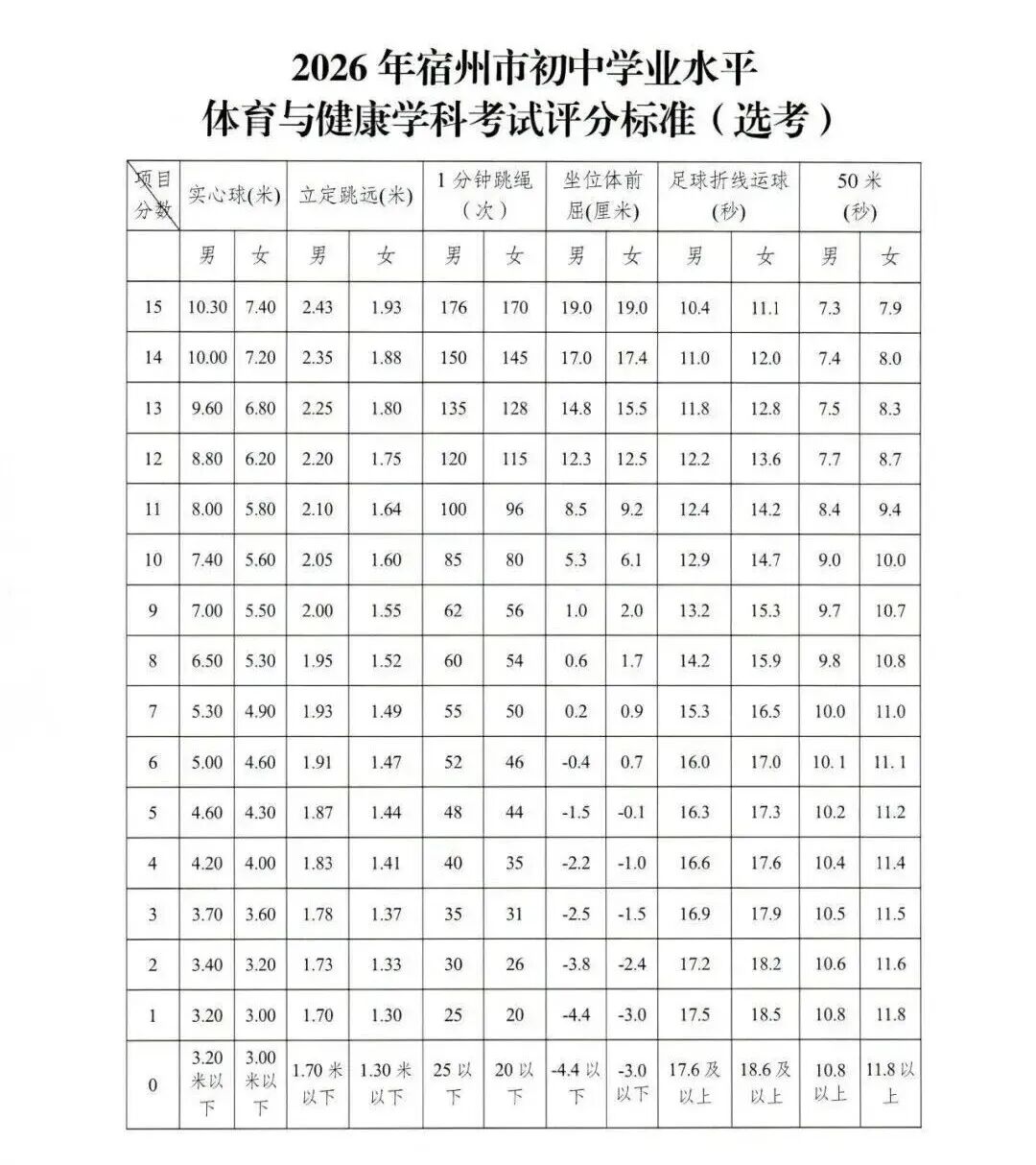 【政策文件】2026年宿州中考体育评分标准出炉!