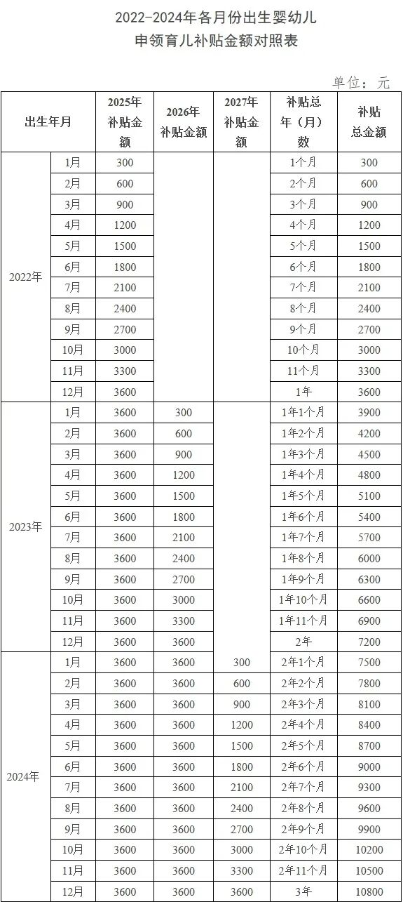 其中,对2025年1月1日之前出生、不满3周岁的婴幼儿,按应补贴月数折算计发补贴。也就是说,2022年1月1日以后出生的符合条件的婴幼儿,都可以领取育儿补贴。
