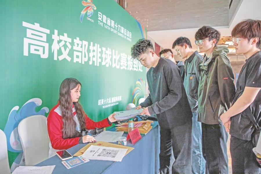 报到现场,随着一辆辆满载运动员的大巴车缓缓驶入,身着各色队服的高校学子们精神抖擞地走出车厢。他们有的肩扛行李,有的手抱排球,脸上洋溢着对比赛的期待与自信。组委会设置了身份核验、资格审查、物资领取等一站式服务窗口。工作人员和志愿者们耐心引导,各代表队依次完成签到、领取证件和赛事手册等流程。来自宿州学院体育学院的大四学生曹天琦报到后表示:“我们怀着激动的心情前来报到,此次出征将以饱满的状态迎战各路强队,发扬宿州学院友善、博学、务实、奋进的校训精神,赛出风格、赛出水平,为校争光!”