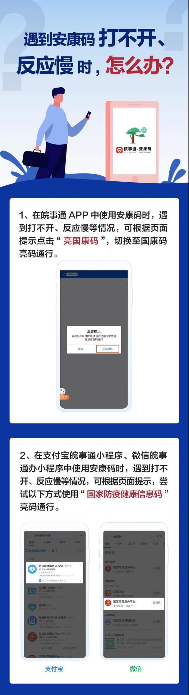 2022年寅虎春节临近,返乡人群增多,人员流动日益频繁,安康码使用量也越来越大。若您在皖事通APP、支付宝皖事通小程序、微信皖事通办小程序中使用安康码时,遇到打不开、反应慢等情况,不要着急,请稍后再尝试。若页面依旧没反应,您可以根据页面提示尝试以下方式使用“国家防疫健康信息码”(简称“国康码”)亮码出行。