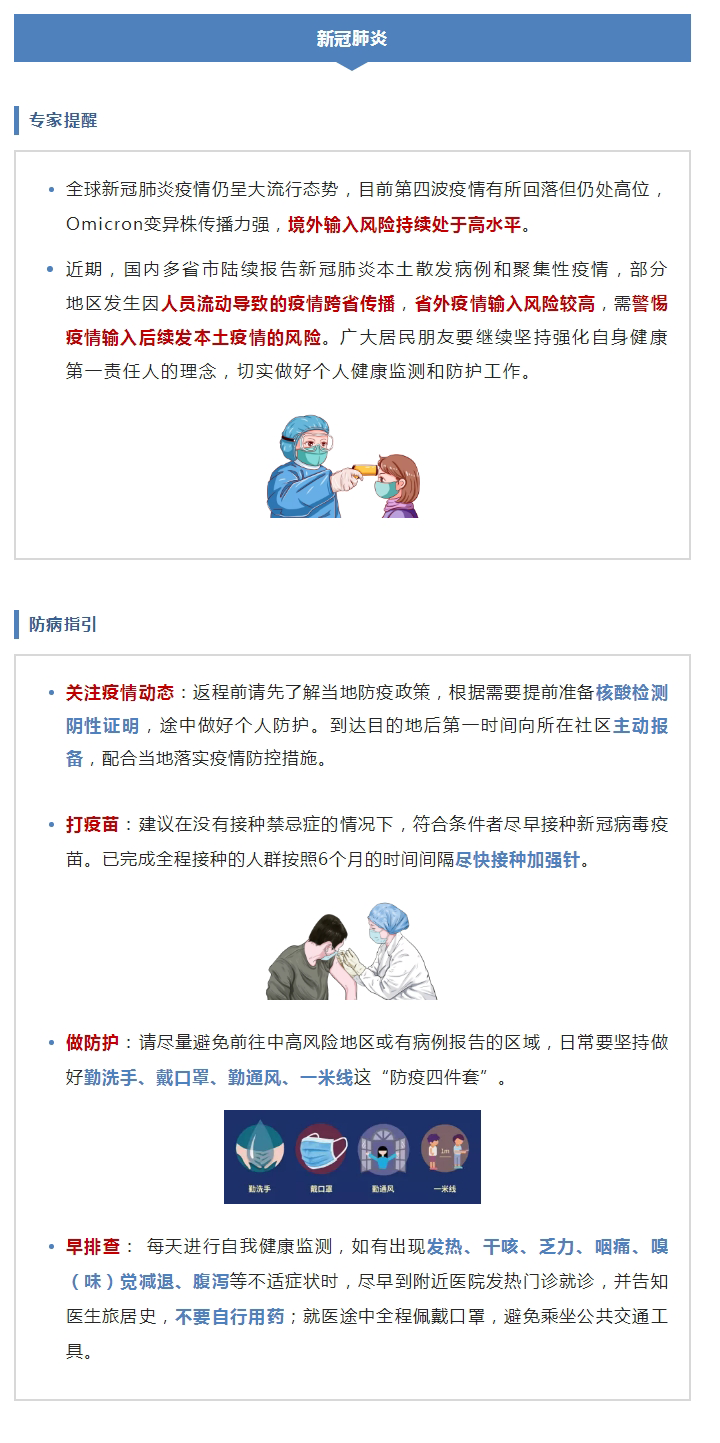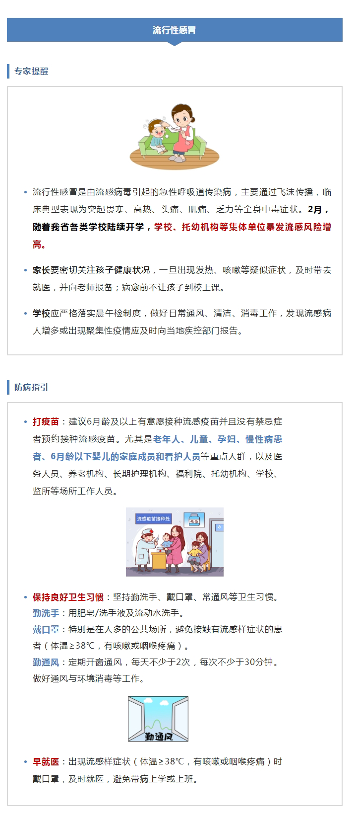 二月份正值我国新春佳节。人群流动性增大、接触频繁,容易造成新冠肺炎、流行性感冒等呼吸道传染病的传播。宿州市疾控中心温馨提醒注意防范新冠肺炎、流行性感冒、诺如病毒感染、人感染禽流感、非职业性一氧化碳中毒和布鲁氏菌病: