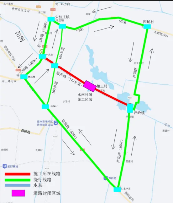 宿芦路即将修建沱河进水闸,经审批,对宿芦路相王村路段进行封闭施工。封闭时间为2025年10月17日至2026年3月16日,其中全封闭施工时间为2025年10月17日至2026年2月10日,半封闭施工时间为2026年2月11日至2026年3月16日。请过往车辆提前绕行(附“绕行路线示意图”)。