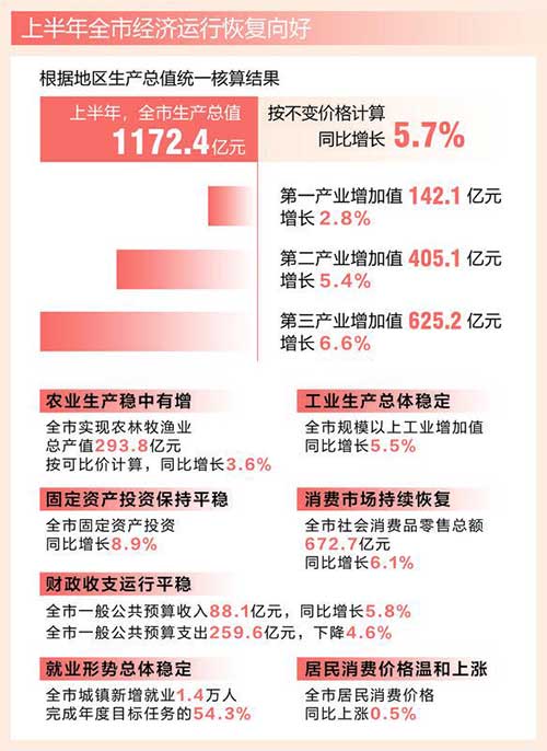 根据地区生产总值统一核算结果,上半年,全市生产总值1172.4亿元,按不变价格计算,同比增长5.7%。分产业看,第一产业增加值142.1亿元,增长2.8%;第二产业增加值405.1亿元,增长5.4%;第三产业增加值625.2亿元,增长6.6%。