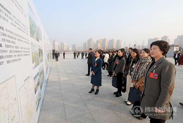 1月12日,市人大代表、政协委员在观看宿州火车站综合改建及胜利路东延项目展板。 记者 苏洋 摄